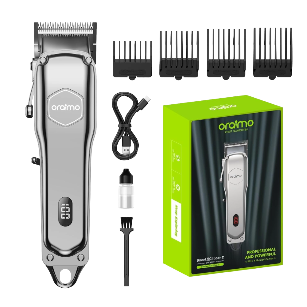 Oraimo Professional Cordless Hair Clipper features a smart display and precision blades for accurate, salon-quality haircuts at home. It delivers powerful performance with up to 150 minutes of cordless runtime for long grooming sessions. Ergonomically designed with USB-C charging, it offers comfortable handling and modern convenience.